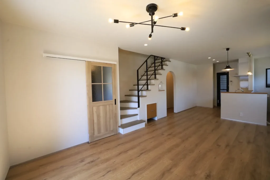LDKの主役は、空間を広く見せるアイアン手摺のスケルトン階段。