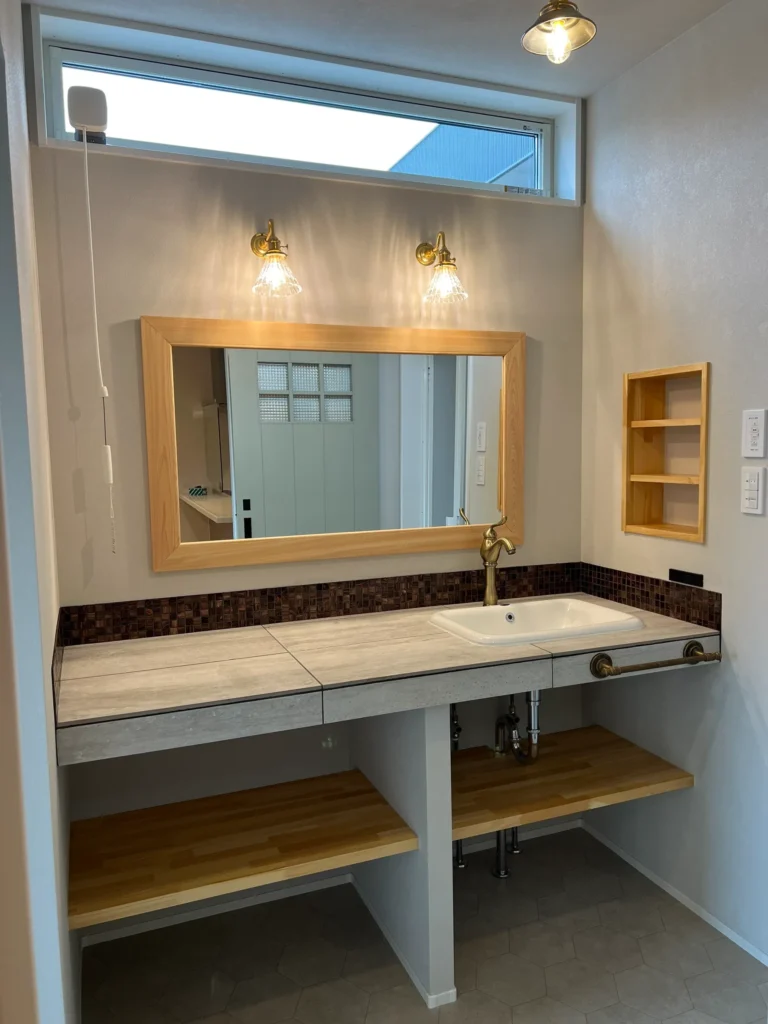 洗面スペースなどの水回りにも、木とタイルを組み合わせた造作家具を採用。
