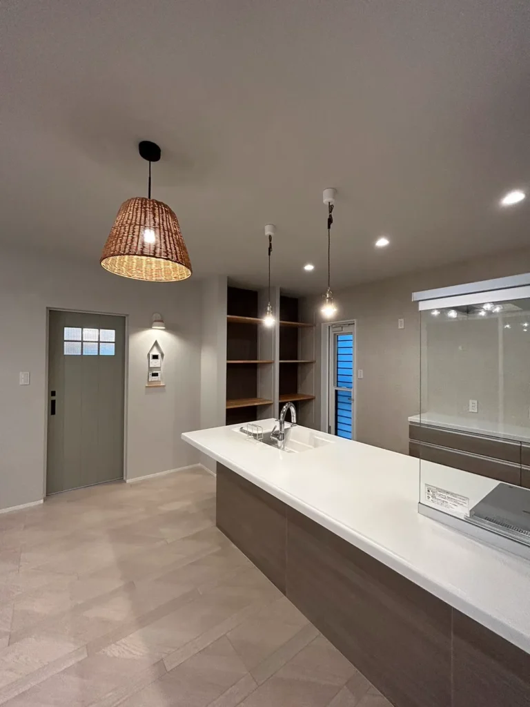 印象的な籐(ラタン)のペンダントライトがダイニングを優しく照らします。