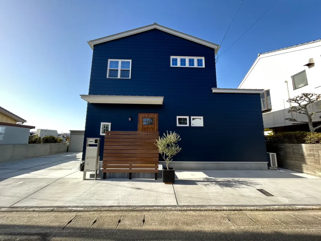 鮮やかなネイビーのラップサイディング(鎧張り)に、