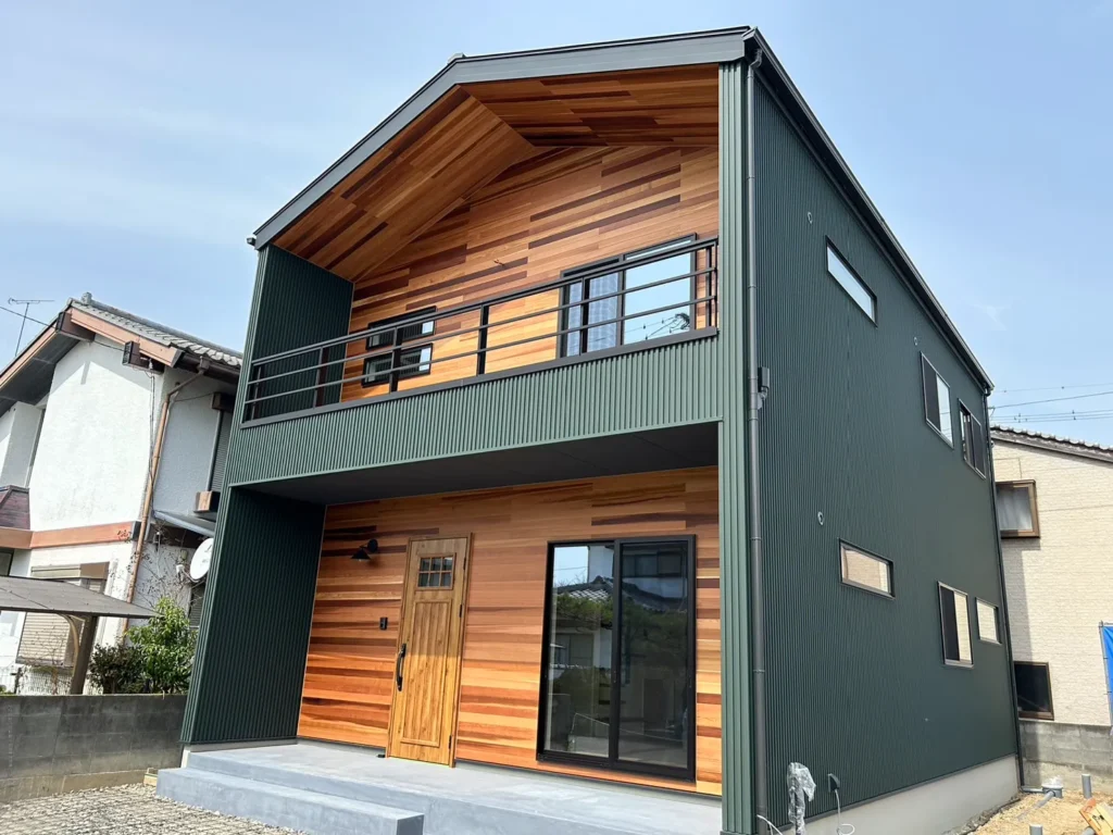 深いグリーンのガルバリウム鋼板に、大胆にあしらわれた無垢板の